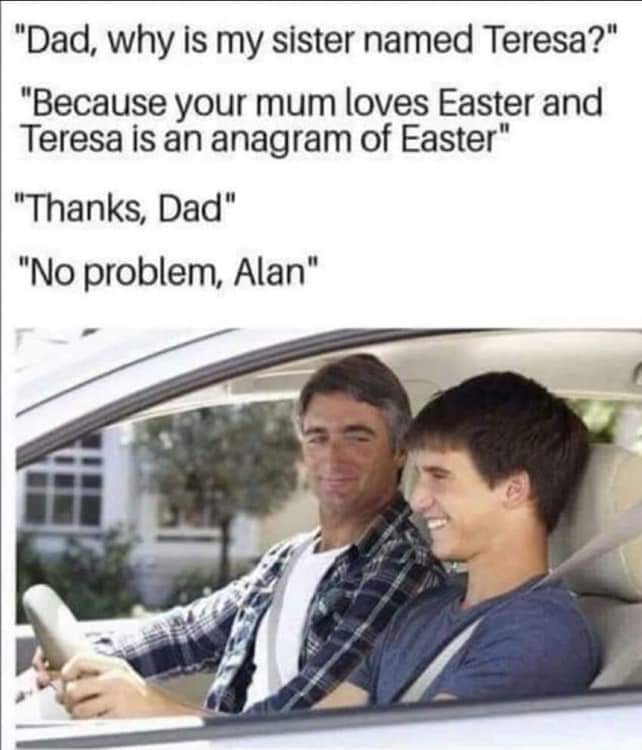 Blutengel Cosa significa esattamente? "Perché mia sorella si chiama Teresa?" "Perché è l'anagramma di easter (pasqua) e tua mamma ama la Pasqua" "Ok grazie papà" "Di nulla Alan" (anagramma di anal) |