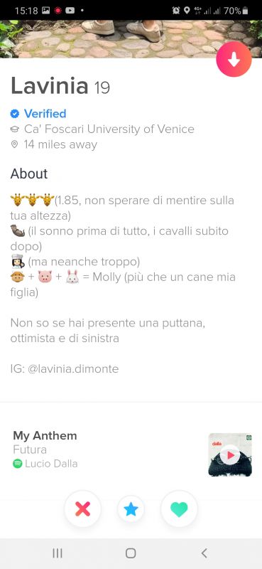 Ho un fidanzato molto carino. E allora che cazzo ci fai su Tinder? (IMG:https://i.ibb.co/rty5bft/4-C2-D25-BD-9-F5-...7-CB1-E1475.jpg) Che domande... Ne cerca uno al top, "carino" per lei non è abbastanza, e te lo dice così non le fai perdere tempo se non sei minimo un modello Però da brava scimmietta non molla la liana prima di aver afferrato quella successiva... D'altronde con la sua laurea (se si è laureata) in storia e l'innata eleganza che Audrey Hepburn scansate proprio direi che ne ha il diritto no? |