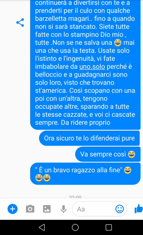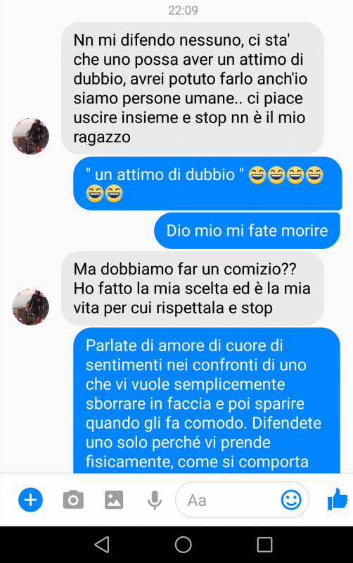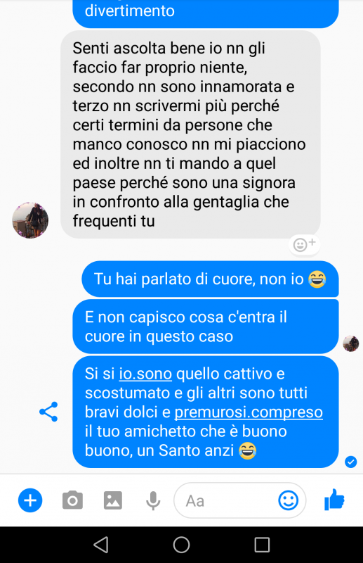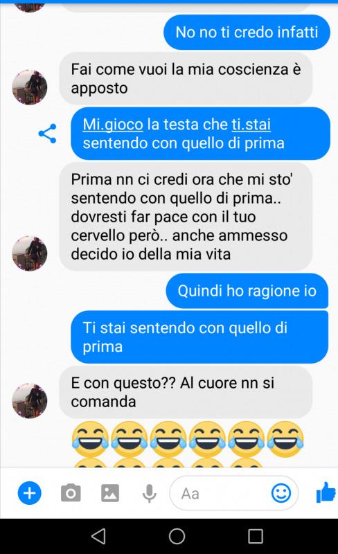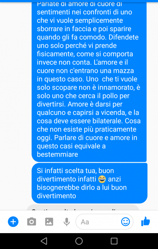 Solamente messaggi, con lei a stressarmi nei giorni passati a dirmi che gli uomini sono tutti uguali e che si stava sentendo con uno che la voleva solo scopare e che ha sfanculato perché " lei non è quel genere di ragazza ". Appunto, si è visto. Coerenza alti livelli