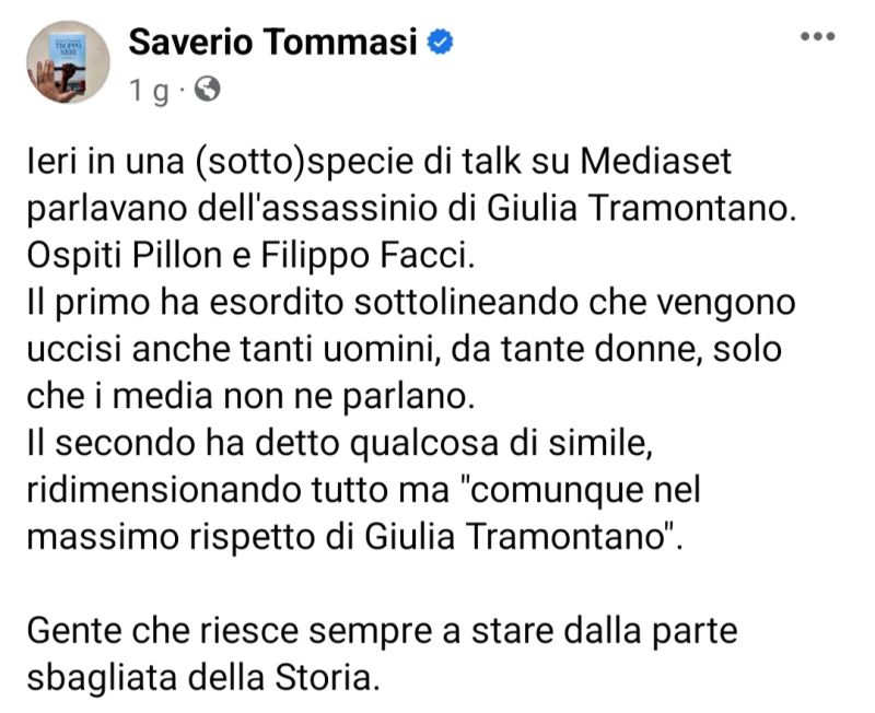 (IMG:https://upload.forumfree.net/i/ff13893694/...41_Facebook.jpg) Se questo è "bravo" allora stiamo a cavallo... Ho cercato un po' di dati, il numero di uomini uccisi da donne in un anno è di gran lunga inferiore rispetto a quello delle donne uccise da uomini, quindi se Pillon ha detto quella cosa sbaglia nel dire che sono "tanti" alla pari delle donne uccise (che infatti neanche le donne uccise sono "tante" se si esaminano i dati europei lol), fa bene invece a dire che non se ne parla mai, perchè comunque anche se un solo uomo alľ anno viene ucciso da una donna se ne deve parlare, dato che di ogni singola donna uccisa da un uomo ne parlano distintamente. imbecille del cazzo.. se è chi penso io che va a fare interviste a provocare e rompere il cazzo è proprio un imbecille la parte sbagliata della storia.. imbecille di merda, pecorone.. xk affermare che ci sono anche tanti uomini che crepano è sbagliato? minchia per na volta che vanno due in tv a dire qualcosa di sensato sto imbecille cerca di sminuire.. ormai lo dicono chiaramente , la nostra vita di uomini vale meno delle np.. ma poi sta gente era la stessa che voleva l uguaglianza fino a quache anno fa.. gente ridicola che se prendi con logica di base in due secondi fai notare tutte le loro incongruenze Sei un imbecille del cazzo tu se pensi che non sia diritto di un giornalista in democrazia intervistare e provocare chi gli pare, e pure chi dal vivo cerca di aggredirlo fisicamente o lo insulta come un bimbo di 8 anni lo è. Edited by Piaso - 9/6/2023, 14:22 |