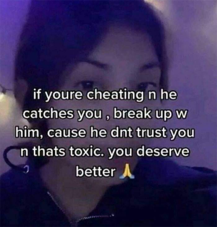 Traduzione? Traduzione: "Se lo stai tradendo e lui ti scopre, lascialo, poiché non si fidava di te e ciò è tossico. Tu meriti di meglio". In pratica dice che se lui scopre la puttana NP che lo tradisce, vuol dire che la seguiva perchè mancava di fiducia e quindi è sleale. Il fatto che avesse ragione a non fidarsi non conta ;-) |