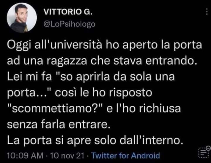 mentre tornavo da scuola con un 4 in filosofia , un 7 in matematica e come unica consolazione un 8.5 in biologia vedo una np in piedi (una 6.5) e davanti a me c era un posto libero , quindi le faccio (visto che non aveva notato il posto) : ehi scusa ma guarda che c e un posto libero lei mi guarda un po così e mi fa: no grazie sto meglio in piedi . Poco dopo si siede vicino ad un altro in fondo al bus Letteralmente NON PERSONA. Se eri un chad sicuro si sedeva |