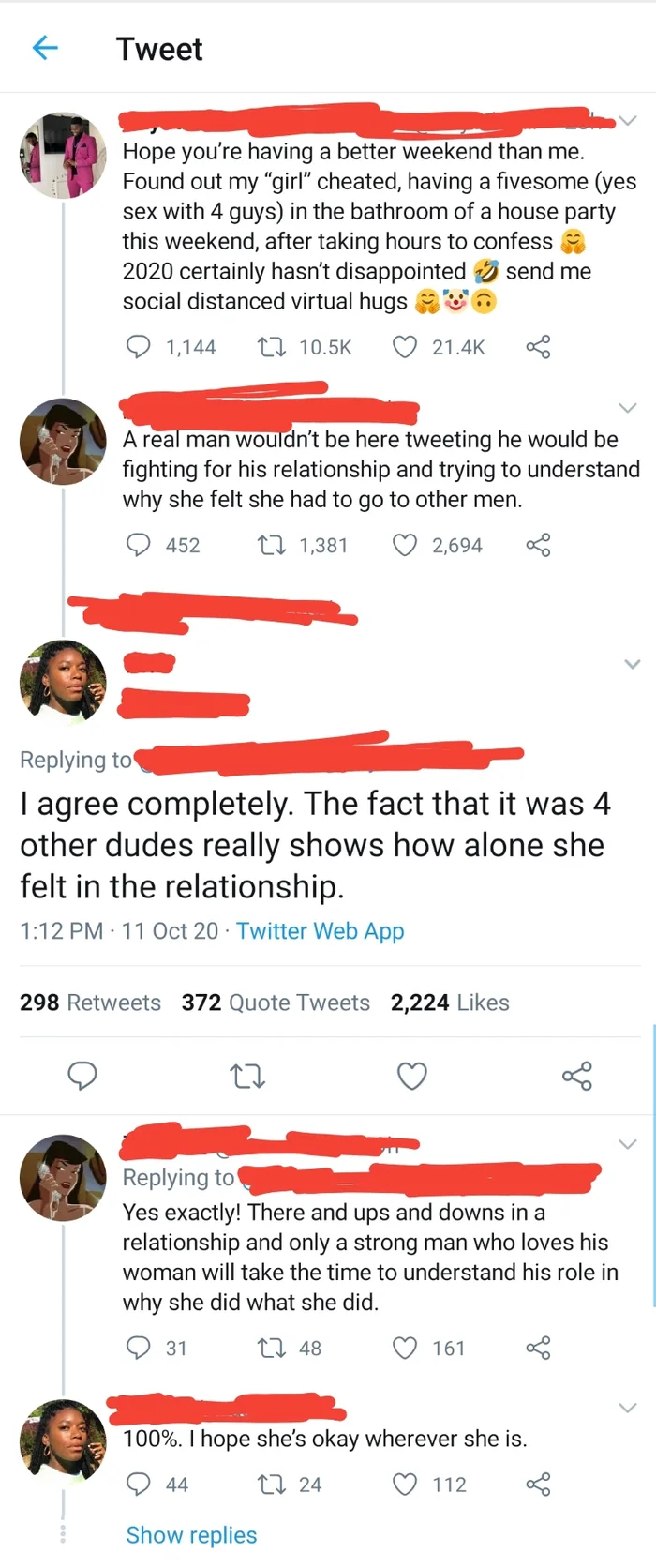 Spero che tu stia passando un weekend migliore di me. Ho scoperto che la mia" ragazza " mi ha tradito in un fivesome (Sì sesso con 4 ragazzi) nel bagno di una festa in casa questo fine settimana, dopo diverse ore ha confessato il 2020 certamente non ha deluso Il vero uomo non sarebbe qui a twittare starebbe lottando per la sua relazione cercando di capire perché sentiva di dover andare da altri uomini. Sono completamente d'accordo. Il fatto che fosse 4 altri tizi mostra davvero come lei si sentisse sola nella relazione Sì esattamente! con e alti e bassi in un relazione solo un uomo forte che ama la sua donna avrà il tempo per capire il suo ruolo in in quello che ha fatto lei Spero stia bene ovunque sia. |