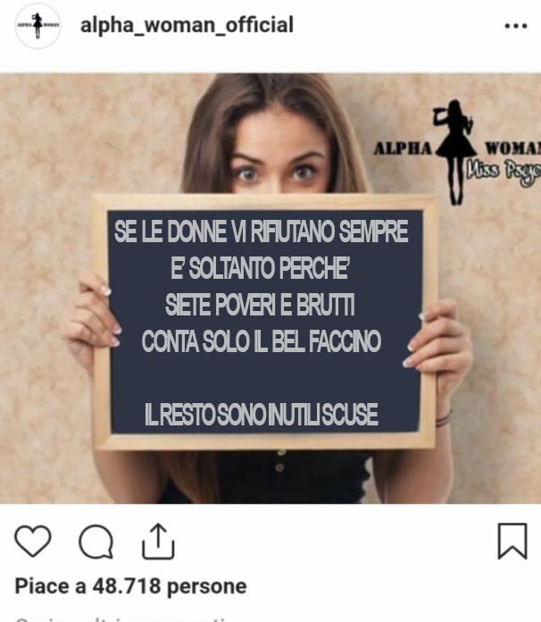 Lasciamo pur stare tutte le stronzate da PUA, di farla ridere, essere intrigante etc. Dico solo che non bisogna essere noiosi con le donne se non si è belli, solo questo. Darei buca anche ad un mio qualsiasi amico se mi facesse cadere le palle così certo, con le donne bisogna essere un clown circense h24, non sia mai una conversazione normalissima le annoi, poverine ancora con ste baggianate, se una donna ti trova simpatico ma non gli piaci esteticamente ti vedrà solo come amichetto, mentre gliela sbatterà in faccia al primo figo musone che incontra |