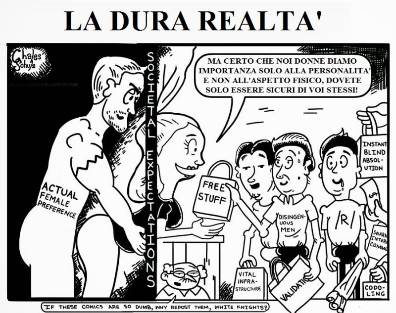 le donne servono come controparte il fatto che tre donne mettano in crisi una intera com di maschi è preoccupante e anzi, svela la verità la donna ha la funzione di ariete SPACCA tutto, gli equilibri mutatele a suon di post se dovete parlare, tanto sono 3 hansel ti considero un buon utente ma purtroppo ho potuto capire che più della metà di quelli che dicono che non vogliono donne sono i primi a cercarle.. ehm ehm il jimmone che invitava a cena una np senza averla manco mai vista in privato scusandosi col fatto che fosse troppo brutta per lui una volta uscito allo scoperto (attualmente lo moggava pure) perdonami ma penso che uno che veramente è insensibile alle donne manco nota i loro commenti il problema, la redpill, è che siete voi a dare importanza attraverso topic e commenti del genere servono da controparte, per equilibrare e ripeto il fatto che tre gatti di merda in croce vi mettano tutta questa ansia e sono capaci di farvi smuovere con tanto di polemiche è decisivo per comprendere se devono solo sparare stronzate sono d accordissimo ma qualche cosa giusta la dicono e cmq voi date contro.. ma sono tre gatte non cagatele e basta e poi come utente della moderazione del forum è notevole la differenza quando c'è figa a quando non ce n e e non è un semplice discorso di tag attiva ma che appunto bisogna vedere le donne come 'scombussolatrici' di un equilibrio basato su conta solo il bel faccino ecc ci sono? ok non ci sono? ok basta attribuire importanza alle donne.. secondo voi se correte da una modella e le dite quanto sei bella.. gliene frega qualcosa? imparate ad ignorare le donne, se non vi vanno bene la donna non aspetta altro state facendo proprio quello che vogliono loro e non c e nessuna risposta alla tua domanda, me l hanno detto anche esplicitamente che si iscrivono con account maschili per non farsi rompere le palle quindi è impossibile stabilire una causa unica di sicuro non sono delle normotipiche con vita sociale o se lo sono abbandonano in fretta quindi nessuna preoccupazione |