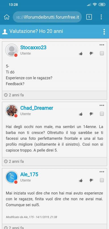 Continuo a restare della mia idea, alla fine è una scelta soggettiva ma comunque non condivido il tuo esempio, se la tua one itis si innamora di te per quello che sei (fisicamente e mentalmente) ti ha dimostrato che comunque hai un valore e sei degno di essere amato, rispetto al rimanere kv a vita, questa cosa ti può aiutare anche quando la relazione è finita. Il mangiare nel ristorante da Cracco invece non ti da nessun miglioramento, se non il ricordo di aver mangiato bene. Ma davvero se domani tu avessi l'opportunità di stare con la tua one itis per qualche mese, rifiuteresti perchè " se è destinato a finire, è meglio non avere niente?" Ti sfugge il mio esempio calzatissimo proprio perché non hai avuto occasione di "mangiare da Cracco e tornare alla Caritas" ma alla Caritas ci sei sempre stato. Con questo non voglio infierire o altro, era semplicemente per constatare la faccenda. Comunque ho detto che sicuramente sia sempre meglio aver avuto modo di vivere le proprie esperienze, ma formalmente vedo che sia sempre stato meglio il non aver avuto affatto piuttosto che l'averlo poi perso. Io personalmente fino ai 16anni non avevo neanche dato il primo bacio con la lingua, ergo alle ragazze neanche ci pensavo minimamente. Sentivo un minimo di disagio ad essere stato uno dei pochi senza ragazza, ma non mi tormentavo di certo. Invece negli ultimi 10 anni abbondanti la cosiddetta ricerca della validazione dalle donne è stata l'unica priorità o quasi, quindi posso dirlo candidamente che si stava meglio quando si stava peggio. Poi ognuno la vede a proprio modo, giusto o sbagliato che sia No in realtà la validazione da parte di una donna l'ho avuta e posso dire di essere felice di averla vissuta, se non avessi avuto niente starei sicuramente peggio. Comunque mi sembra normale che a 16 anni la cosa non ti pesava, è con l'invecchiare che il non aver avuto esperienze comincia a tormentarti, non quando sei ancora un ragazzino. |