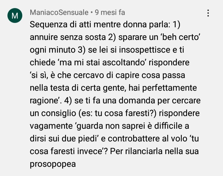 Funestovento per quando le tue colleghe ti parlano ![]() trovato tra i commenti del seguente videofilmato https://m.youtube.com/watch?v=0BCDZxf32Ts No deve dirgli cose sessualmente esplicite e ai limiti dell'indecenza così non gli rompono più i coglioni. |