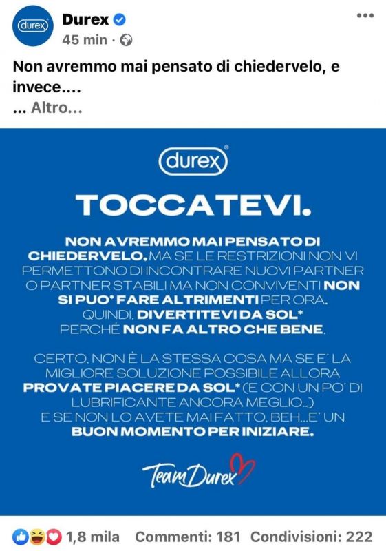 Secondo quelli di durex alcuni non si sono mai segati perché scopano regolarmente, secondo loro il sesso è scontato, crudo. Voglio morire |