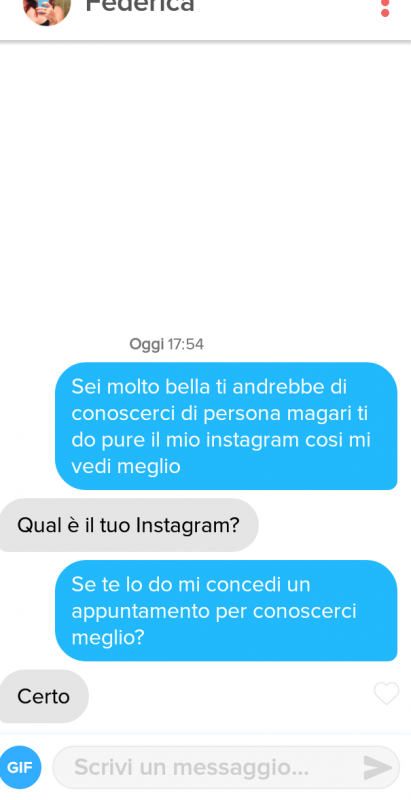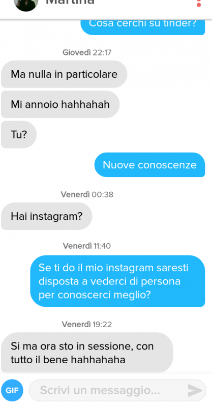 Con questo post voglio dimostrare quanto sia facile per un belloccio organizzare appuntamenti con delle ragazze a caso su tinder in pochissimi messaggi,avrei potuto continuare all'infinito ma credo che questi screen bastino...per chi dice a mai una gioia "non ti risponde perche sei annoiante" come potete vedere io scrivo sempre le stesse cose è la faccia che cambia..ne ho cosi tanti di screenshot che e un casino linkarli tutti anche usando ff upload,per ora linko solo questi anche perche devo segarmi SPOILER (clicca per visualizzare) |