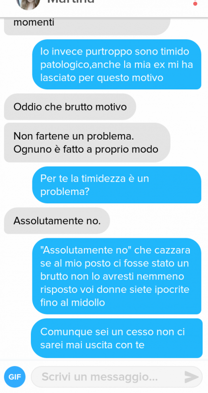 Con questo post voglio dimostrare quanto sia facile per un belloccio organizzare appuntamenti con delle ragazze a caso su tinder in pochissimi messaggi,avrei potuto continuare all'infinito ma credo che questi screen bastino...per chi dice a mai una gioia "non ti risponde perche sei annoiante" come potete vedere io scrivo sempre le stesse cose è la faccia che cambia..ne ho cosi tanti di screenshot che e un casino linkarli tutti anche usando ff upload,per ora linko solo questi anche perche devo segarmi [SPOILER][/SPOILER] non si legge un cazzo |