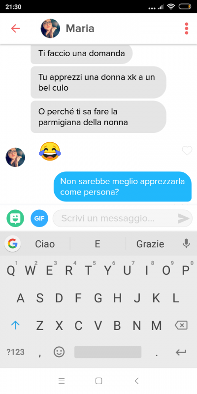 comunque maria ha fatto chiaramente capire che ha il culo grosso ma cucina bene. Quindi te la dà molto volentieri, non è affatto da disprezzare. Inoltre era ironica e con quella risposta l'ha fatta sentire una merda, un rifiuto umano. comunque su tinder sono da evitare tutte quelle che mettono foto solo del viso, nel 98% dei casi sono delle megattere. |