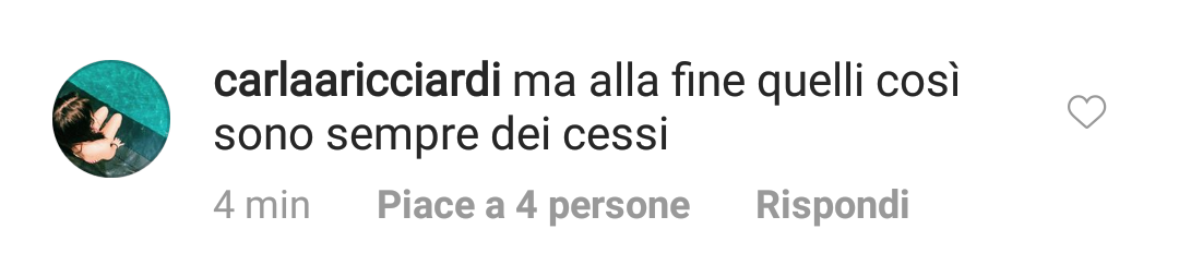 | Chissà invece che splendore l'autrice del commento;sarà la classica cessetta che grazie ai 5 kg di trucco sul viso si sente una dea. |