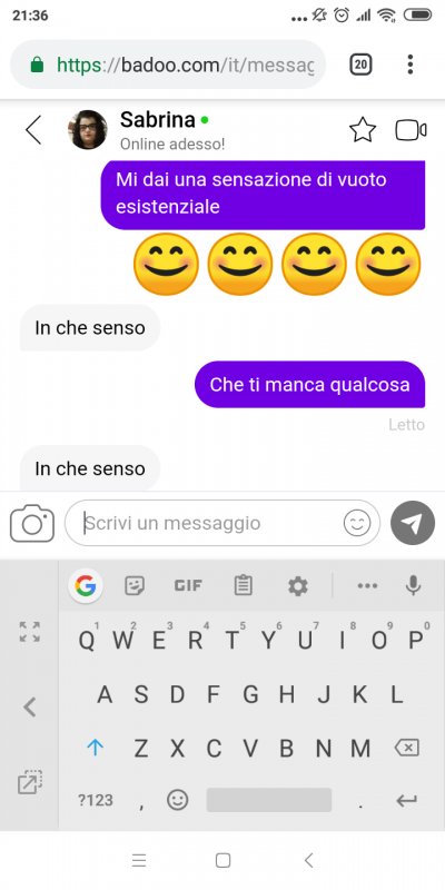 Che tristezza, proprio una non vita, ragazza brutta di una provincia di merda, che per giunta mi ha risposto alla mia battuta di dubbio gusto... "Lo so" |