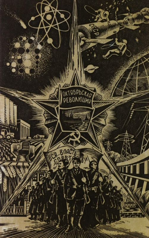 Октябрьская революция - Rivoluzione d'ottobre Spazio, scienza, industria, agricoltura ed energia, i traguardi della rivoluzione simboleggiati dai soldati in marcia. A.Sergunin - 1980 |