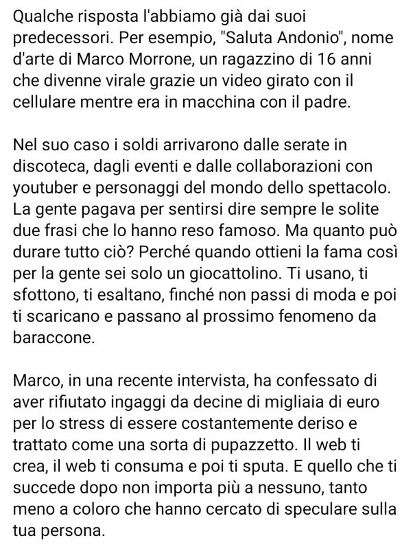Facile sputare sul piatto dove ha mangiato. Quando è stato intervistato da Diprè,quando ha fatto la canzone sui piedi conosceva l'altra faccia della medaglia. Lanci la pietra e nascondi il reato? Mi spiace, ma non và così la vita, si raccoglie quel che si semina. Hai raccolto fama e merda, oramai la fama è finita e non ti rimane che mangiare merda. Sarà prossimo a farla finita se non farà qualcosa accettando la sua condizione, so perfettamente cosa si prova dietro quei post che scrive e che hai condiviso. Freddo e blackpillato; l'unica possibilità per diventarlo è frequentare forum di questo genere ed è l'unica possibilità che ha per salvarsi, perché li fuori il mondo è più cattivo di quanto pensa. Quei post li scrive per chiedere aiuto, ma più di un abbraccio con l'emoji e qualche testa di cazzo che gli scriverà "arriverà anche per te la ragazza giusta" poi dal vivo lo deride, non può avere. Su luoghi come questi redpill può sentirsi veramente ascoltato, come la donna che è stato ad ascoltarlo per cinque minuti seduta con lui a tavolino, ma qui avrà molta più compagnia. Sopravvivere o morire soffrendo, a lui la scelta. |