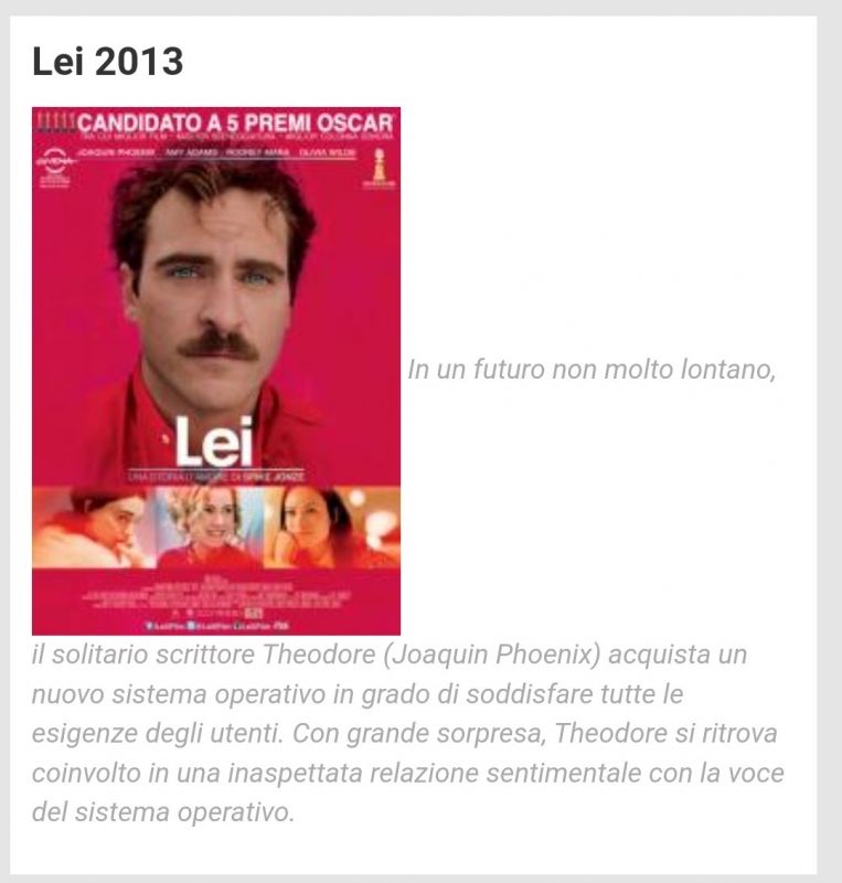 Sul tema un film "Lei", con Joaquin Phoenix. La vita e l' amore di un uomo con l' AI: ![]() Edited by jionathan - 10/9/2020, 21:31 |