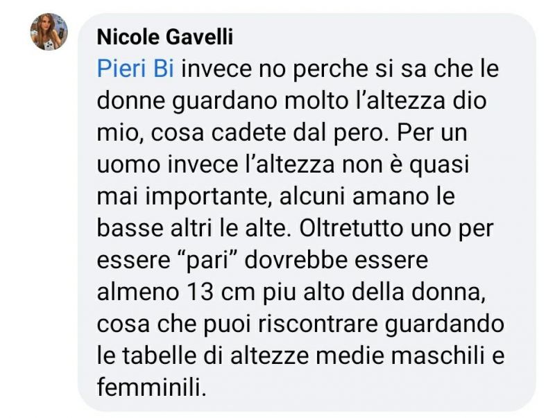 meglio esseri alti e con viso da 6 piuttosto che bassino col viso da 8 cmq questo commento non l'ho trovato nel suo profilo, potete dirmi in che post lo ha fatto? |