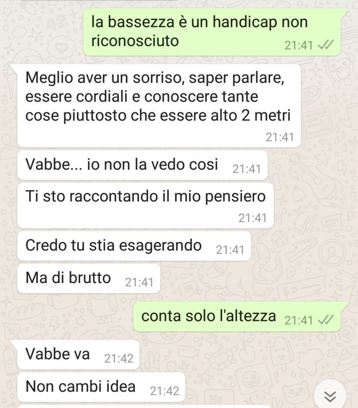 mesi fa in estate ho avuto una crisi e ho detto a mio padre che la colpa è anche sua perché si è trovato una nana come moglie e siccome entrambi sono brutti e bassi non dovevano fare figli. giorni dopo mi ha dato ragione e mi ha detto che se potesse tornare indietro non si sarebbe mai sposato e non avrebbe nemmeno comprato casa. almeno lui c'è arrivato, mia mamma nulla |