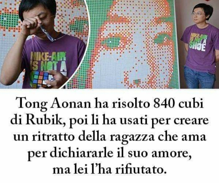 https://edition.cnn.com/2016/05/12/asia/ch...love/index.html In questo articolo dicono che: ha speso $460 solo per i cubi (e non oso immaginare quanto tempo, visto che gli 840 cubi di Rubik non sono propriamente risolti, ma sono stati impostati per seguire le linee del ritratto ed ogni cubo, a parte certe sezioni di bianco e verde, presenta un pattern differente), non è dato sapere quanto è costata la cornice su misura per contenere il tutto, ma la risposta è sicuramente più di un paio di scopate con delle troie over 7; la tipa ha rifiutato lui, ma ha accettato il ritratto (double cuck); l'N.P. non ha nemmeno la decenza di mandare due dei suoi chad a ritirare l'opera, visto che il povero Tong ha confessato che la sua prossima sfida sarà trovare il modo di spostarla dal suo appartamento (triple cuck). Assurdo... persino peggio di quell'utente del forum che comprò tutte le miniature di Star Wars per prendere un caffè con una np |