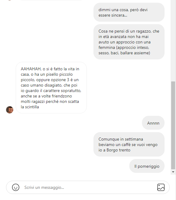 Crudo qui si sente tutta l'inesperienza di una np 19enne... una intorno ai 25 anni non ti avrebbe mai dato una risposta del genere magari l'avrebbe pensato ma ti avrebbe risposto in modo molto più politically correct
