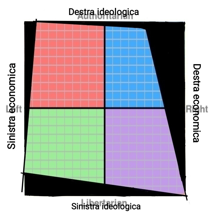 Sicuramente al quadrante verde in basso a sx, sinistra liberale e libertaria. Il blu è il quadrante in alto a destra, rappresentante destra autoritaria e sociale. |