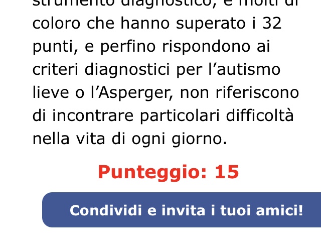 CITAZIONE Nel primo esperimento ampio di utilizzazione di questo test, il punteggio medio del gruppo di controllo è stato di 16.4. L’ottanta per cento delle persone con diagnosi di autismo o di un disturbo collegato ha ottenuto un punteggio di 32 o superiore. Il test tuttavia non è uno strumento diagnostico, e molti di coloro che hanno superato i 32 punti, e perfino rispondono ai criteri diagnostici per l’autismo lieve o l’Asperger, non riferiscono di incontrare particolari difficoltà nella vita di ogni giorno. Punteggio: 36 nulla di nuovo |