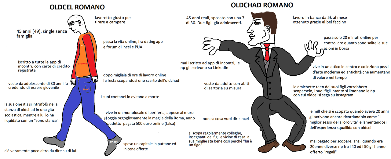 e quindi come fa uno a 30 a divertirsi e scopare poi? Il concetto resta lo stesso, contano le tappe giuste vissute al momento giusto. Conta andare a 10 anni sul brucomela, conta andare 16 anni a Gardaland con gli amici, conta andare a 18 a Rimini/Gallipoli/Mikonos con gli amici... Andarci a 30 anni in mezzo ai ccciovani nessuno te lo vieta, ma fai ridere. Puoi dire quel che vuoi, ma é palese che tu stesso hai una voragine interna proprio dovuta a ciò che ti è stato negato ai giusti tempi. Tant'è che sei qui dentro a 45anni vantandoti dei risultati con la pesca a strascico e considerandoli vitali (fondamentale il 2% di risultati dichiarati di riuscita), come se la rivalsa a 40 anni e le 30 tizie scopate in 15 anni ti possano far vivere gli anni giovanili persi. Cosa vuoi sentirti dire, che sia meglio scopare tardi rispetto al mai? Hai davvero bisogno di sentirti valorizzato constatando l'ovvio? LOL E c'è ancora gente che consiglia di andare dagli psicologi, portateli da me che con 50 messaggi (e 50 euro a nero) in totale cinismo faccio una cartella clinica meglio dei vendifuffa... |
