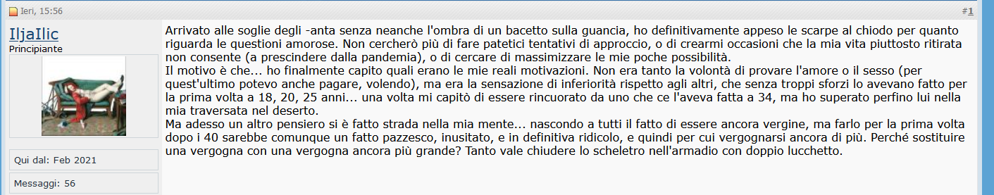 vi dico solo che una volta assaggiata la gnagna, anche se non con la one itits dei sogni, con la paura che se vieni mollato, rimarrai solo, è forte, lo era allora, prima dei socials, oggi credo ancora di più. Quotazzo ragazzi, quotazzo. Tra l'altro il fatto di essere rimasto solo non ha fatto altro che aggravare quella redpill che recondita risiedeva nel mio animo. |