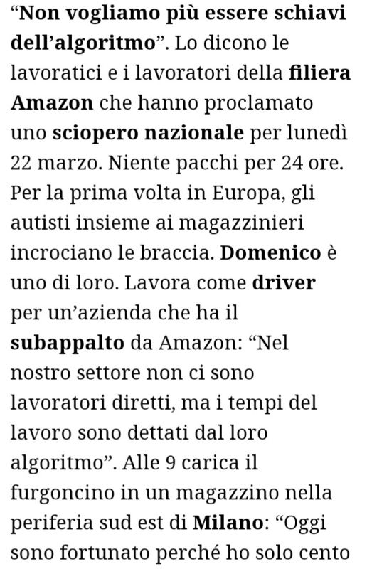 Ci sono lavoratori di Amazon che si sono suicidati. Infatti non ci compro mai nulla. E qualcuno ha ancora il coraggio di dire che Marx è acqua passata. O si passa al socialismo oppure assisteremo sempre di più a questo abominio. |