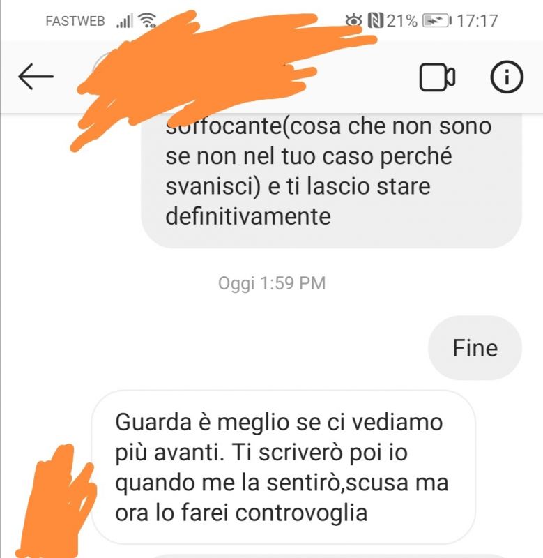 Bene,per concludere la discussione non vuole più vedermi dopo che le ho detto determinate cose che io trovavo giuste nei suoi confronti in maniera diretta e coincisa sui modi di fare troppo evanescenti ed allo stesso tempo troppo dolci,neanche fossimo in quella cagate di Skam italia per mentecatti di 18 anni pieni di disagi artificiali.E non sopportavo il fatto che lei fosse soffocante come una bambinetta che vuole fare la "cucciola" del suo ragazzo.Altra cosa che detesto. E la risposta è stata questa. Neanche questa volta non capisco dove ho sbagliato.È la verità. Questa è stata la sua risposta... Così tutta questa storia almeno si conclude con un senso,finisce qui e passerò avanti senza pormi tanti dubbi. Io gli ho detto ciò che dovevo. (IMG:https://upload.forumfree.net/i/ff13484790/...0430_172545.jpg) Con il suo "ci sentiamo più avanti" per me può evaporare per sempre. Si va avanti e di certo senza dubbi. Questa è la vera conclusione di questo caotico delirio a parer vostro. E sono 5+,6-,6 e un paio di sette tempo fa.Quindi una persona anonima,impersonale,senza limiti e perirono noiosa e bruttina ,quindi preferirei non esistere a questo punto.Credo che su questo punto quanti si sentono come me? 5 cristo santo...è come essere interessanti quanto un cuscino. Penso che questa conclusione sia un bene per tutti e due. Onestamente non credo che tu, per il momento, con quello che senti, sia adatto ad avere una storia. Risolvi prima la tua rabbia e il tuo rancore, quando riuscirai a sentirti in armonia con te stesso allora potrai provare ad avere una relazione che non sia tossica con un'altra persona. |