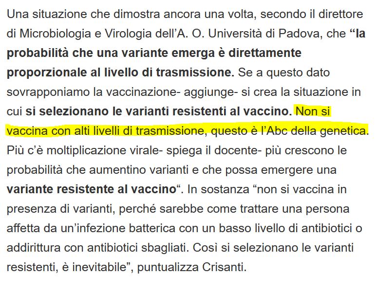 Eh niente, ormai pure le virostar stanno cambiando film. (IMG:https://upload.forumfree.net/i/ff13514823/...0630_101425.jpg) Quando è vero, è vero però... E quando anche I.A. ha ragione, tocca dargliela. Stanno dicendo tutto e il contrario di tutto... Non è il nostro "argomento" nè focus principale. Ma stanno facendo un diavolerio inaudito. E si può dire, senza ovviamente sopraffare chi la pensa diversamente. Intanto ho spostato le discussioni aperte da Sant'Asintomatico sui vaccini in Off Topic, luogo più proprio. Concordo, si può non essere d'accordo con Asintomatico, ma molti dei post che linka sono veritieri e non complottari... Crisanti è un clown del circo, tutti i virologi non sanno più che pesci pigliare... prima è obbligatorio vaccinarsi con lo stesso vaccino per entrambe le dosi, poi no, anzi è meglio fare un mix di vaccini... La variante delta è coperta già solo con la prima dose di vaccino, poi invece bisogna attendere la seconda dose per poter FORSE (termine usato dai virologi) stare tranquilli... intanto, 32 milioni di italiani che avevano prenotato le vacanze con la green card (perché avevano fatto la prima dose, e avevano detto che bastava la prima dose per poter viaggiare con la green card), ora sono costretti a dover rinunciare al viaggio in quanto a causa della variante delta, non basta più solo la prima dose... Ma decidetevi, o perlomeno alzate la mano e dite "non ci capiamo un cazzo manco noi, navighiamo a vista"... |