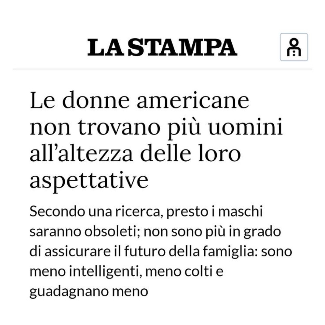 Il bello è che se un uomo dicesse che non trova più donne all'altezza delle sue aspettative verrebbe deriso nella migliore delle ipotesi, e condannato come misogino fascista nella peggiore e riceverebbe post d'odio da parte di una delle tante pagine femministe presenti sui social. Che mondo meraviglioso che hanno creato gli uomini occidentali. Sì, gli uomini occidentali, perché la colpa di quanto sta avvenendo è solo la loro che per un pelo di vagina si fanno trattare in questo modo. |