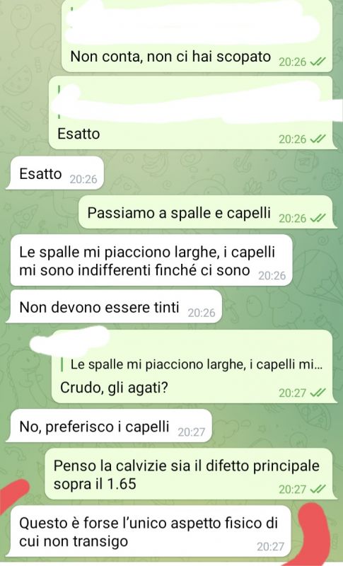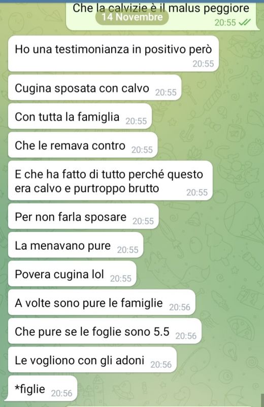 Per qualche ragione alla cavizie viene - talvolta - associato un qualche sorta di stigma sociale un po' come ai maschi rossi di capelli (mai capito perché), almeno questa è la mia esperienza. Pensa averli entrambi come me che culo... |