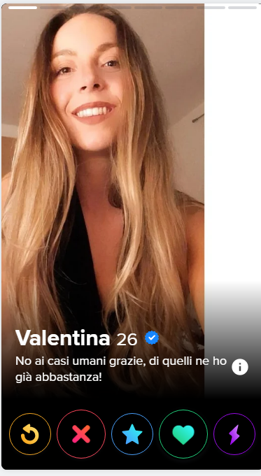 Sì ma infatti se quella ha 26 anni sta messa male proprio... Come minimo ce ne ha 7/8 di più. Si scalano l'età perché se mettono quella vera matchano quelli di 10 anni di più, ma quelli se non sono miliardari non li guardano nemmeno Comunque per me "caso umano" nella bio = fanculo all'istante, ma chi cazzo sei tu sfigata su tinder per dire chi è un caso umano, lo sei evidentemente tu per prima |