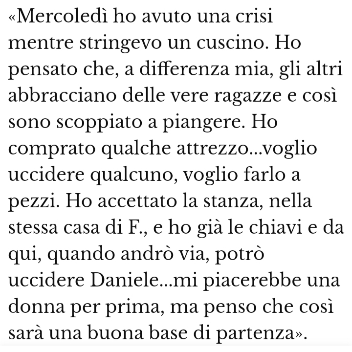 | perchè parlate tutti di " delitto incel" lui semplicemente veniva provocato dalla coppietta di innamorati, lui li ha ammazzati perchè stufo di subire tali vessazioni, è stato giusto così? io direi assolutamente no, al massimo 2 bei pugni in faccia al provocatore e la cosa finiva li, inoltre de marco non è nemmeno un vero brutto, è trasandato e vestito anni 1940, bastava sistemarsi i capelli un pò, provarci con un po di tipe, e non chiudersi in casa a scrivere pensierini depressi, conoscendo il soggetto si aspettava che le np arrivassero da lui come se fosse brad pitt, senza fare assolutamente nulla, dubito anche che ci abbia provato con diverse np. Per una serie di cose sto ragazzo ha fatto una cagata colossale a fare ciò che ha fatto |
