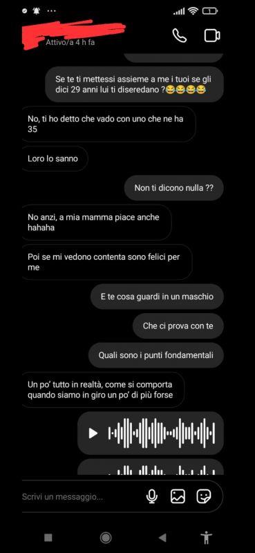 Un amico mio ha portato due np, al bar e insomma dopo un po' di battute, un po' di doppi sensi e flirt vari, i miei complimenti per i suoi piedini, al tavolino del bar, insomma morale della favola,dissi a questa 18 enne mi piaci, dammi Instagram, lei mi disse vai aggiungiti, gli ridò il telefono inizio a messaggiarci il giorno dopo e emerge questa cosa, che ne pensate del fatto che lei ha 18 anni lui 35? Però non sono fidanzati, lei mi aveva detto, ogni tanto ci vediamo ma sono single... Screenshot_2022-06-22-05-14-34-475_com_2Screenshot022-06-22-04-49-52-935_com_3