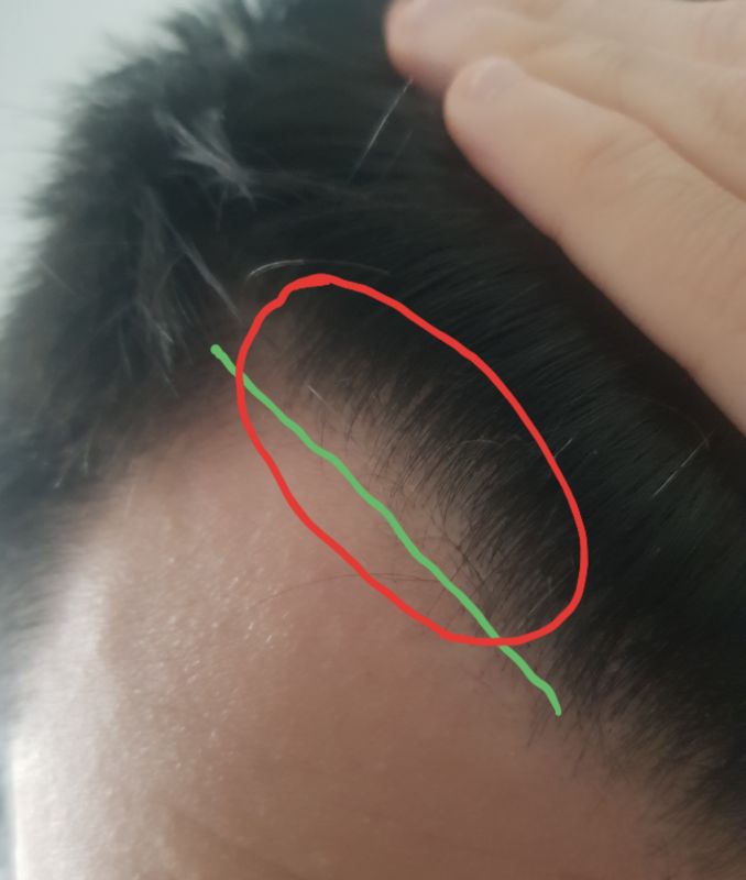 Non posso assumere antiandrogeni seri perché mi fanno somigliare a una bambina grassa (ritenzione idrica, deposito lipidico nella tettina sinistra etc), prendo solo serenoa (lol) Volevo integrare minoxidil anche se sono sempre stato contrario, ma è efficace sulle tempie? Mi basterebbe dare un minimo di copertura nella zona cerchiata in rosso (la linea verde rappresenta il disegno della vecchia hairline ormai andata a puttane), per il resto so che è finita/mai iniziata SPOILER (clicca per visualizzare) |