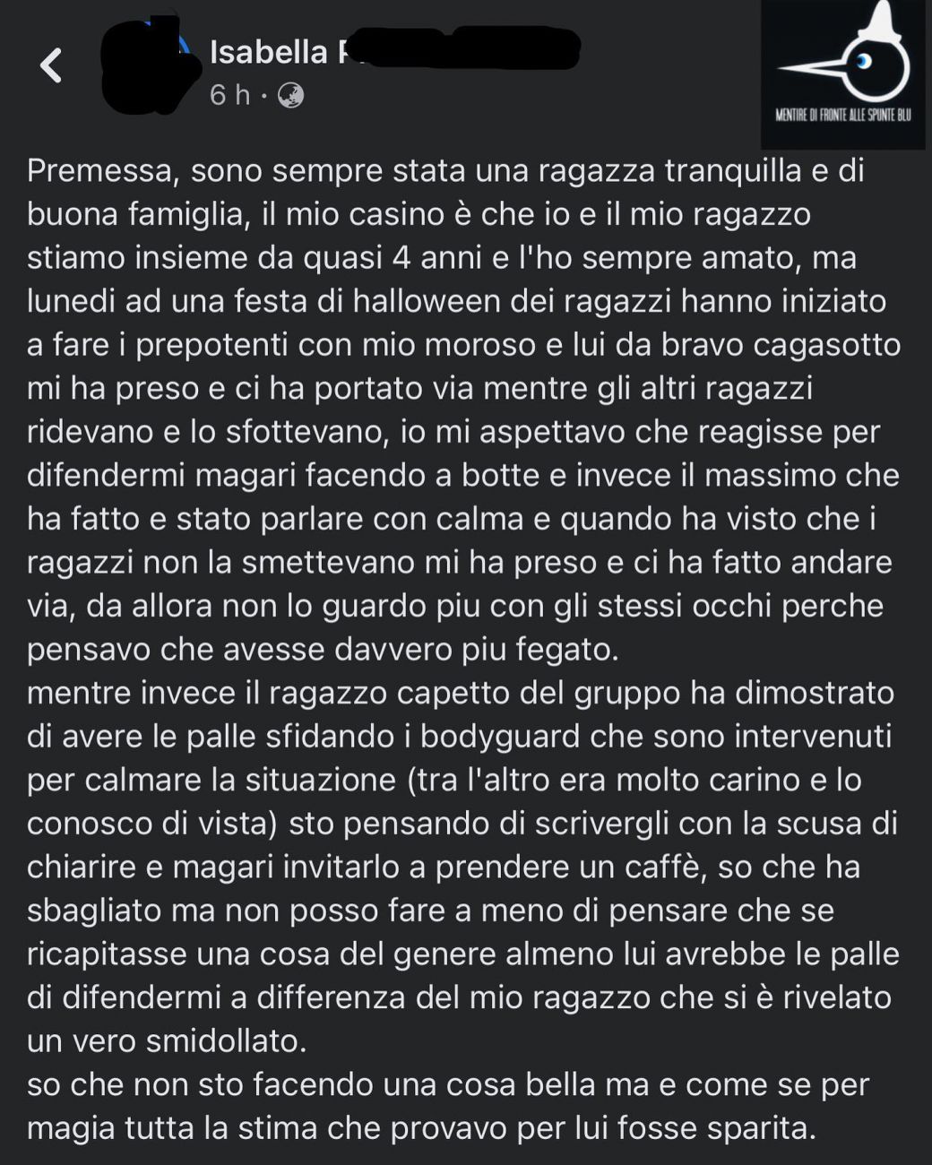 Buona sera ragazzi ho trovato questo commento su mentire di fronte alle spunte blu , mi piace quel sito se sono storie vere , ripeto se , sono storie di vita interessanti , ecco stasera propongo questa storia già proposta in un altra discussione , è inutile dire che il livello di troiaggine è arrivato a livelli cosmici , ma questo commento mi ha veramente fatto male , lo usato nell'altra discussione come esempio di come le donne vedono nel comportamento diciamo BETA in questo caso uno scacciafiga un repellente fortissimo , di mio dico che questo ragazzo trovandosi contro 5 individui 5 non uno ha dovuto battere in ritirata nessuno e cosi pazzo da farsi pestare da 5 ragazzi che poi presi uno a uno chissà se avrebbero fatto lo stesso i gradassi , lascio a voi i commenti o GLI INSULTI , so che saranno tanti ma il mio intento e solo quello di capire se cosi si può dire il pensiero delle donzelle emancipate indipendenti ma che vogliono comunque il maschio PREPOTENTE MANESCO , INSOMMA IL CLASSICO BULLO !