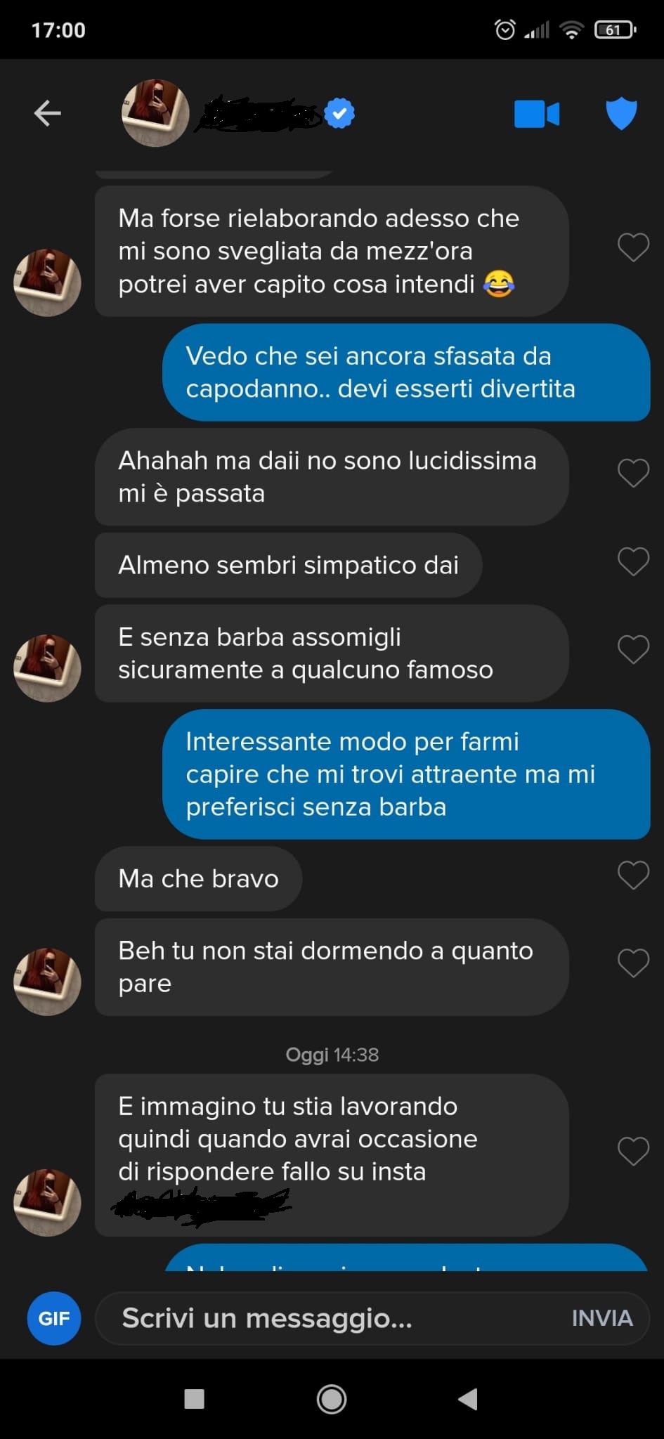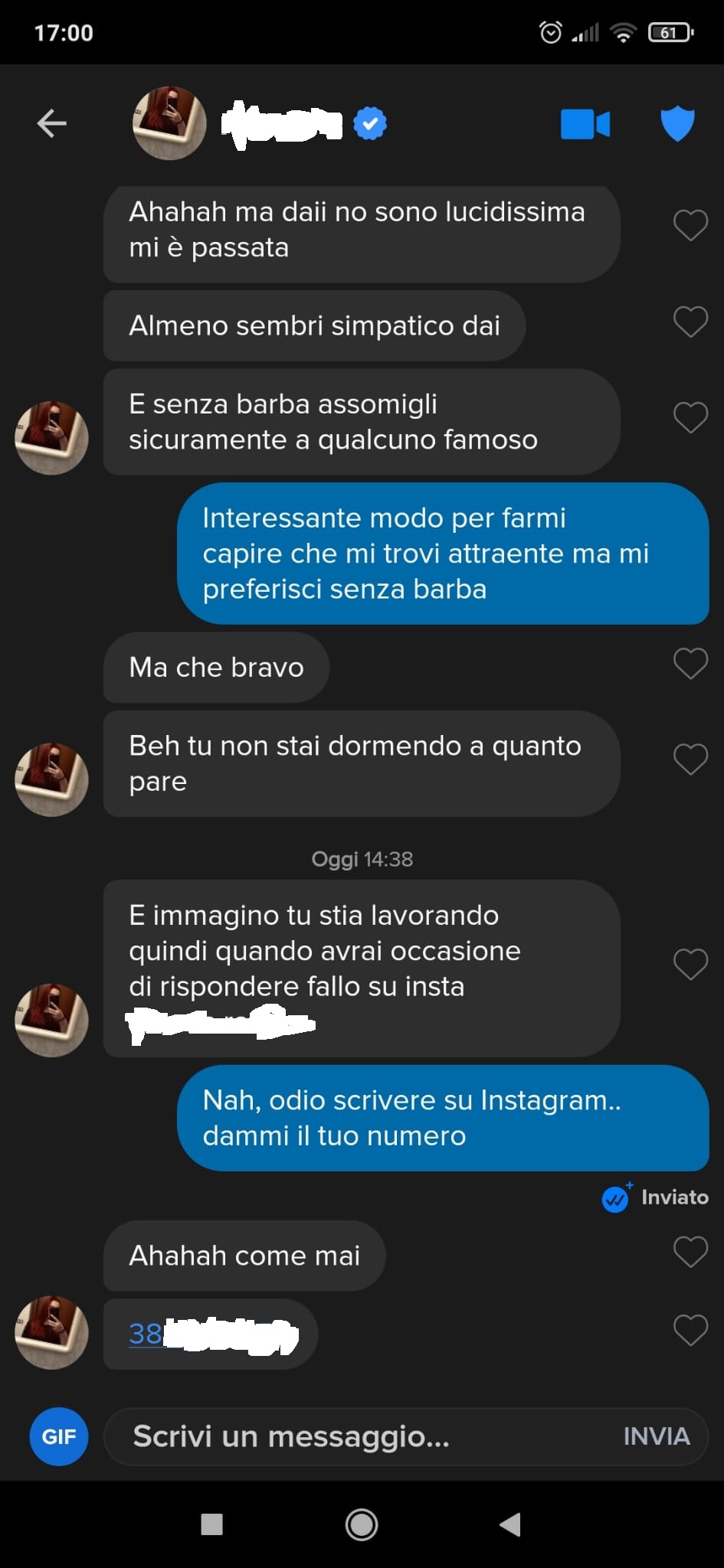 Non le rispondo per 20 minuti perchè ero dal barbiere e quasi si lamenta della mancanza di attenzioni che le do. Allora cerca di chiudere pensando che mi stia perdendo e mi da il suo instagram.