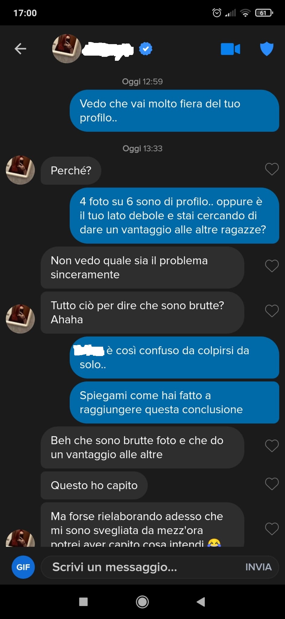 Chi vuole analizzare la chat è libero di farlo. Chi vuole evidenziare errori è liberissimo di farlo, non mi offendo. Volevo portare qualche esempio di chat che non fosse lo stile iper agressivo di asintomatico che mi fa cringiare da morire solo a guardarlo. Bravo lui se funziona. Ma dubito che sia utilizzabile da tutti. Si deve avere le palle cubiche. Il mio approccio è molto più da secchioncello che gioca a scacchi. Se avrò altri successi in chat li portero per discuetere anche quelli.