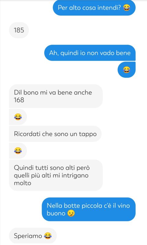 ma secondo me basta essere piu alti di lei e va bene tipo se lei è alta 170 e sei 171 gia vabene No bro, non funziona così |