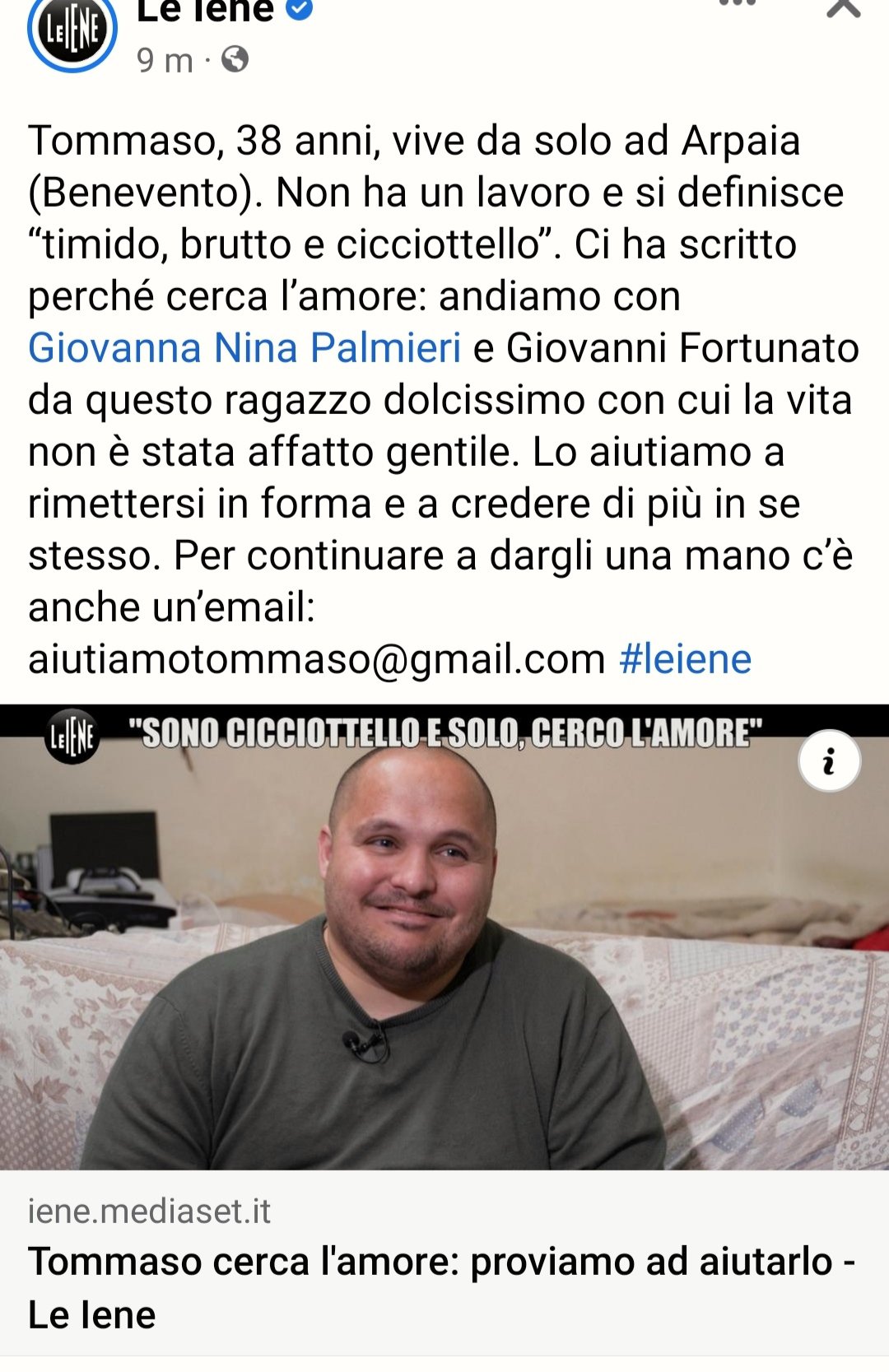 Cicciottello? Peserà 110kg almeno Comunque contatterò anche io le iene x vedere se mi aiutano |