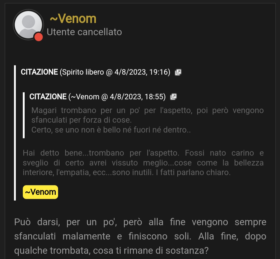 "Alla fine dopo qualche trombata cosa ti rimane"? Disse quella con un bc di 10, ma forse anche superiore😅 Eh già alla fine cosa ti rimane dopo una trombata, di sicuro la gente sul forum che scopa col contagocce o non scopa proprio a parte una netta minoranza ti capisce... Di certo sentirlo dire da una con una bc a 2 cifre e tutt'ora fidanzata fa un po' ridere... |