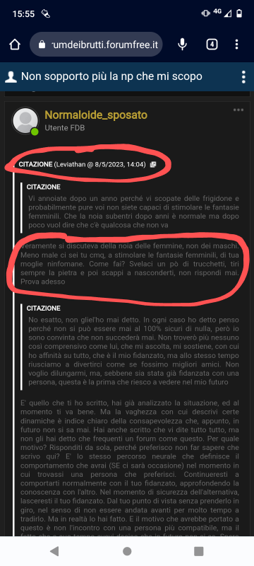 Mamma mia, ma veramente fai finta di non capire? E' un multi - quote il tuo, il mio messaggio è quello sotto in risposta a Benny (che sosteneva di dire tutto al suo fidanzato e io le facevo notare che probabilmente non gli aveva detto del forum ecc). Quello che tu sottolinei è palesemente di Bardack, si capisce dallo stile. Sei tu in malafede, come sempre. E ninfomane non è un insulto, te lo rispiego per l'ultima volta. Le caratteristiche degli individui non sono offese, masturbatore compulsivo non è un insulto. Tu invece usi qualsiasi parola per offendere. Adesso c'è l'hai anche con i calabresi, non bastano neri ed ebrei. Mi fai davvero pena, non pietà. Lo stile di Bardack è completamente diverso, quello è il tuo stile da zittella inacidita, non avevo dubbi che avresti negato l'evidenza, sei un essere patetico. Certo, ninfomane non è un insulto ma calabrese lo è 😂. Mi sa che quello coi complessi sei tu qua. Poi parli tu che qualche messaggio fa hai criticato turchi e cileni? Sei proprio un coglione (non è un insulto, è una tua caratteristica) |