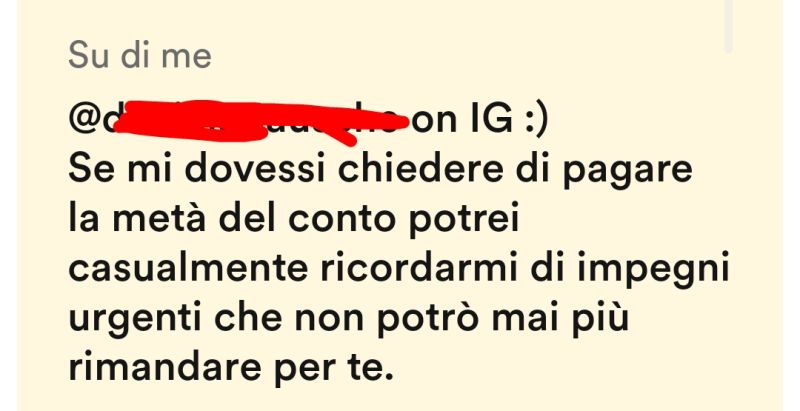 Dimmi che cerchi il provider, senza dirmi che cerchi il provider. (IMG:https://upload.forumfree.net/i/ff13665264/...9981fa92335.jpg) Senza vergogna ahahahahha, poi si chiedono perché gli Incel odiano certi tipi di donne, ma come fai a non augurare il peggio ad una così? (IMG:https://upload.forumfree.net/i/ff13665264/...9981fa92335.jpg) Non cercano il provider, la prima cerca un soprasoglia per fottere, la seconda un Asintomatico che le paghi cena. Qualcosa come il 50% delle donne che usa tinder ha ammesso di usarlo per ristoranti gratis. |