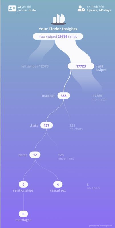 Non hai idea della velocità con cui swipano a sinistra, sono delle macchine, ci mettono 3ms a decidere se vale la pena dargli una chance o meno. Comunque è pieno di queste stats, è un gioco che fanno all'estero, postati sia da maschi che da femmine. Non è fake. |