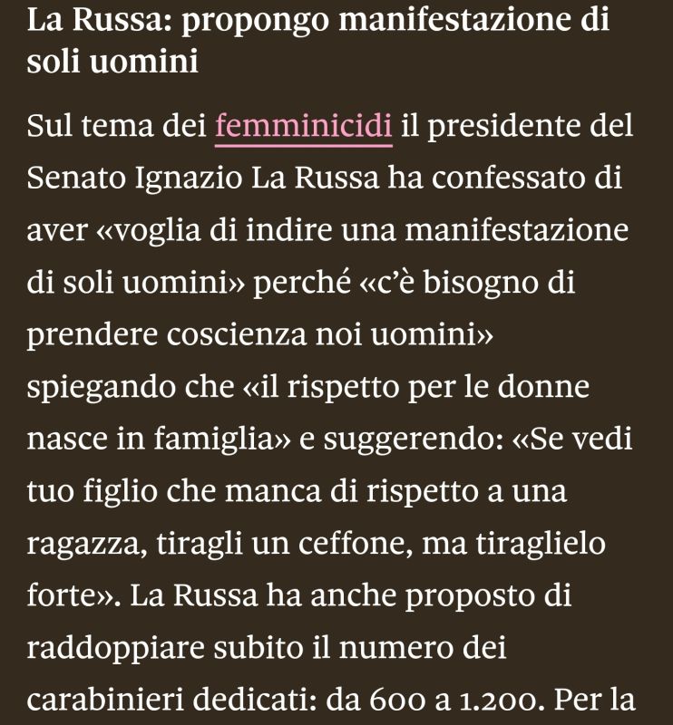 Per le donne che mancano di rispetto agli uomini invece cosa facciamo? Niente. SPOILER (clicca per visualizzare) Se lo fanno è solo colpa degli uomini ovviamente. del patriarcatoh e della scienzah pure... che non guasta mai, poi chiamano pure il geologo gaio ed il cerchio si chiude E come?! Più di metterti al gabbio mica possono fare. Renitenza alla leva. Sarebbe proprio il minimo. Preferisco fare il terrorista che arruolarmi per questo stato di merde. Comunque non accadrà, quindi si fa tanto per chiacchierare. in tempo di pace vai al gabbio, in tempo di guerra è un altro paio di maniche, se si mette male ti fucilano, così come nella prima guerra mondiale ci stava un ufficiale dietro alla truppa che quando dovevano partire gli attacchi sparava a quelli che non scavallavano la trincea o che tornavano indietro, eliminati sul posto |