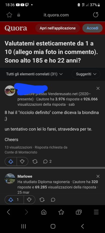 [QUOTE=CessoAppilato,27/6/2023, 18:38 ?t=79748156&st=15#entry666042995] (IMG:https://upload.forumfree.net/i/ff13882508/...ng_Internet.jpg) Conte è ancora su quora a chiedere valutazioni🤣 (IMG:https://upload.forumfree.net/i/ff13882508/...ng_Internet.jpg)lol Quanto gli danno? [/QUOTE una biondina gli ha dato 8 Rimrochia le stacy bionde su Quora. Hai capito il furbetto.. |
