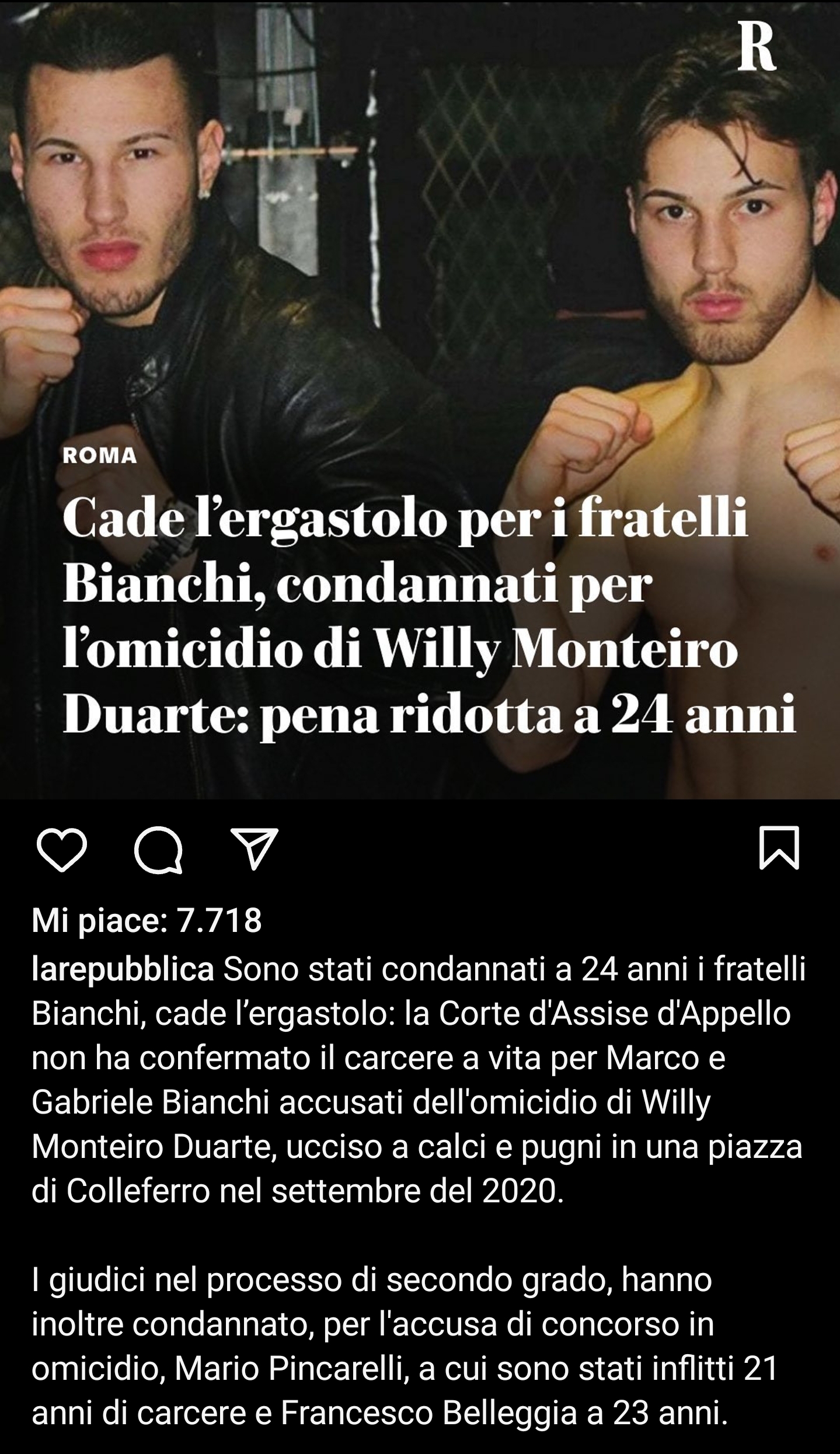 Giudicate voi. (IMG:https://upload.forumfree.net/i/ff13491203/...8_Instagram.jpg) Qua ho vinto una scommessa, quando ero entrato sul forum avevo detto su un thread sui fratelli Bianchi che gli avrebbero tolto l'ergastolo con le solite cose: svuota carceri e buona condotta in primis e con un utente, che mi aveva detto che non sarebbe andata così gli dissi:" vedrai che tra uno o due anni gli sconteranno la pena a 25 anni e poi magari gli ultimi 5 a casa col braccialetto elettronico. Sulla parte dei 25 ci ho preso in pieno...vediamo poi. |