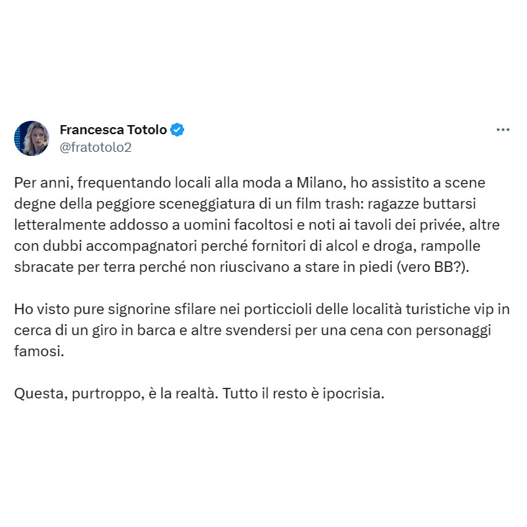 Lí per lí non è che puoi fare niente, tantomeno te ne puoi andare. Se è la prendi da parte successivamente in separata sede e gliene dici 4 Ma pagare automaticamente non solo per lei ma anche per un terzo che non conosci... bè diciamocelo senza mezze misure è una cosa proprio da blatta da fogna 🪳 Stai scherzando? Lì per lì le spieghi che l'invito era per lei e solo lei, e che tu non intendi disturbarla se sta con un suo amico, la saluti e saluti pure l'amico con una vigorosa stretta di mano e un sorriso di circostanza Girato l'angolo prima la blocchi ovunque e poi cancelli il numero Ragazzi queste sono cose che FORSE possono capitare a 16 anni, non certo a 30, non scherziamo per favore Bisognerebbe proprio non infilarcisi da principio in queste situazioni del cazzo se si ha materia grigia, tanto premesso quello che dici è giusto ma da un'altra parte mi hai fatto venire li e mi hai fatto sprecare benzina, rimango e passo la serata sticázzi Naturalmente né ti egoboosto nel durante né ti lecco il cúlo, e una volta finita arrivederci e buona vita. Senza bloccarla così fai la figura dell'incoerente e passi pure per matto (te) Edited by Mataloh - 9/8/2023, 11:14 |